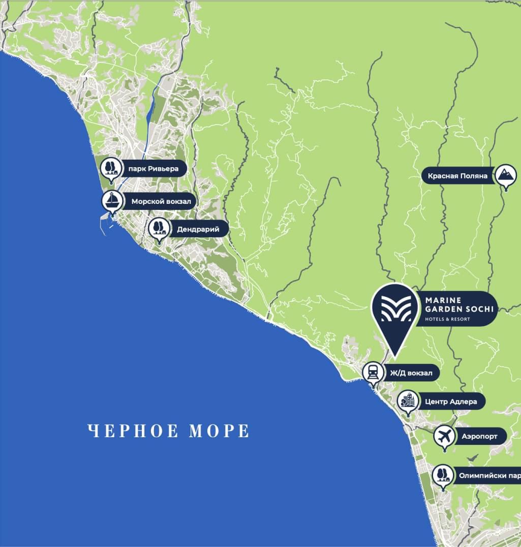 «Marine Garden Sochi» Hotels & Resort - крупнейший курортный комплекс, расположенный между живописным зеленым массивом и панорамным морским простором района Хоста города Сочи в уединённой парковой зоне площадью 8 га с собственной культурной и развлекательной инфраструктурой.